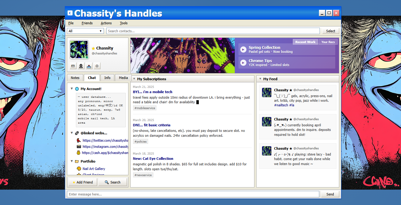 Y2K-desktop interface built as a functional windowed environment—complete with tabbed navigation, live feed simulations, and embedded booking triggers—layered over gritty custom illustration. Every pixel serves conversion: service drops, pricing, and DM inquiries flow through a retro-futurist social dashboard where appointment booking feels like operating system navigation.