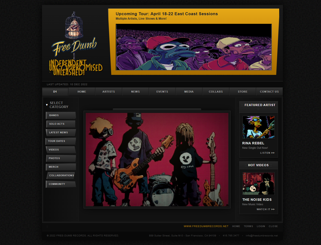 Underground music portal built on a dark, industrial interface system with hierarchical category navigation and multi-format media distribution. Artist rosters, tour infrastructure, video archives, and e-commerce unified under a gritty, illustration-driven brand identity that prioritizes content discovery and community engagement.