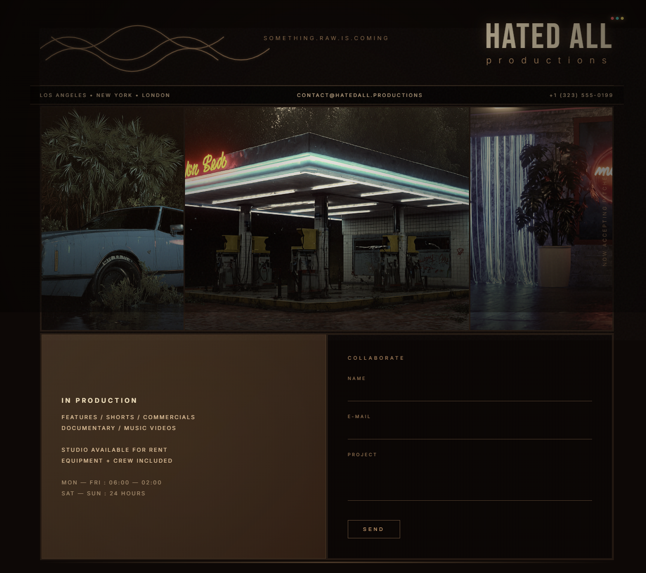 Cinematic studio hub showcasing visual identity with immersive, large-format imagery and precise lighting. Streamlined for production highlights, crew info, and direct collaboration inquiries, serving as both portfolio and operational gateway.